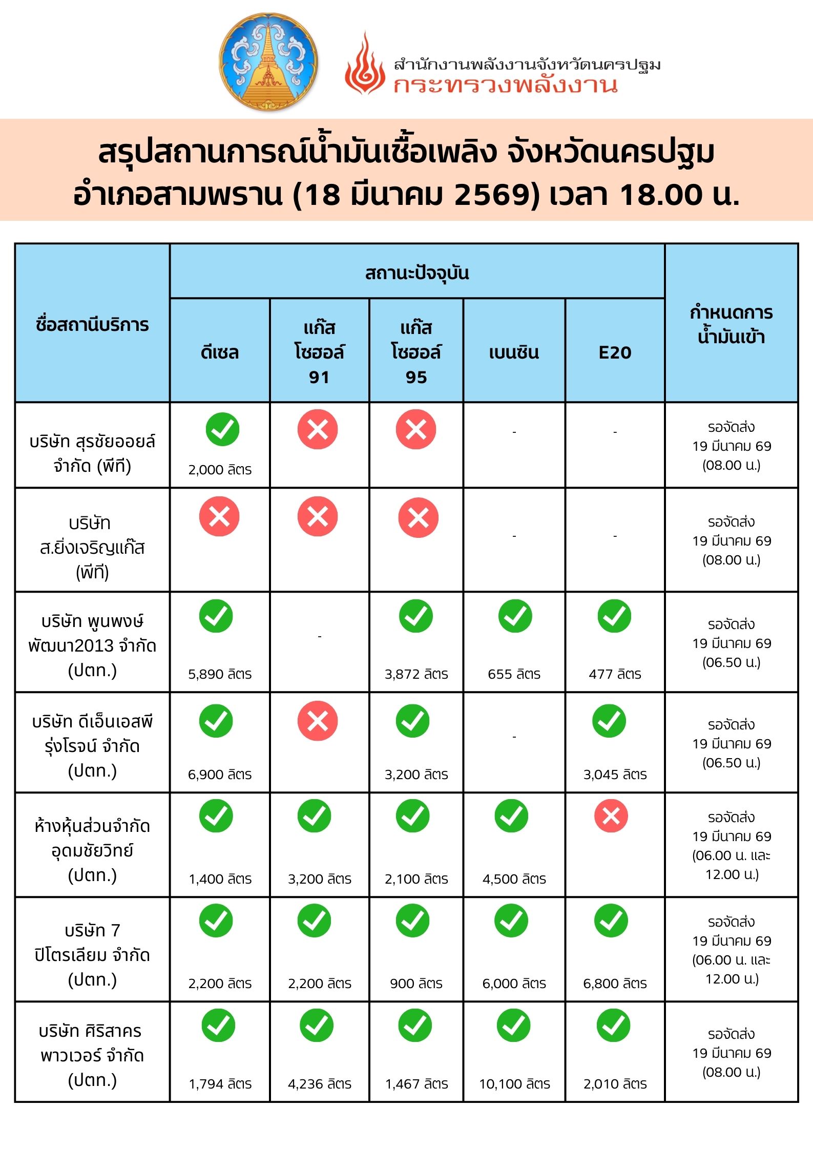 สำนักงานพลังงานจังหวัดนครปฐม รายงานสถานการณ์ประจำวันที่ 18 มีนาคม