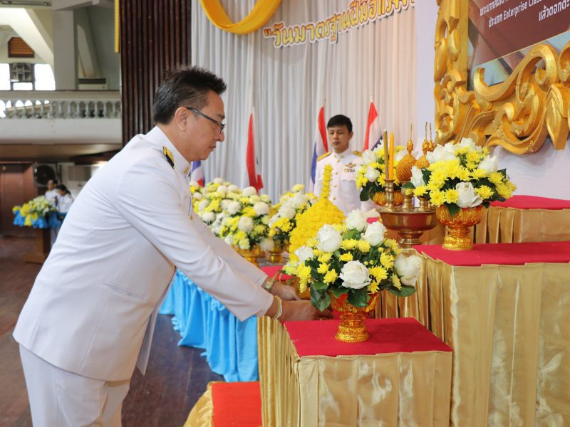 กาญจนบุรี. พิธีวางพานพุ่มถวายพระราชสักการะพระบิดาแห่งมาตรฐานการช่างไทย ในงานวันมาตรฐานฝีมือแรงงานแห่งชาติ