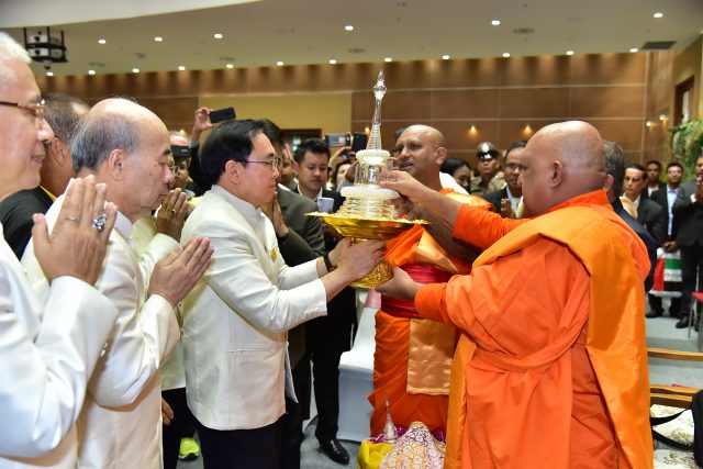 ซึ่งคณะสงฆ์ นำโดยพระวรกโกธะ ศรีญาณรัตนมหานายกะ พระสังฆราช นิกายสยามวงศ์ ประเทศศรีลังกา พร้อมด้วย ผู้ทรงคุณวุฒินานาชาติ และแขกผู้มีเกียรติ ได้ร่วมกันอัญเชิญพระบรมสารีริกธาตุจากประเทศศรีลังกา