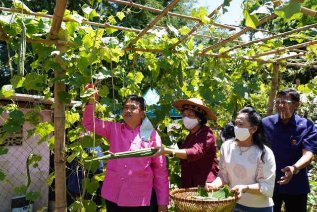 พร้อมกันนี้ได้ยกตัวอย่างความสำเร็จในพื้นที่ อบต.โก่งธนู อ.เมือง จ.ลพบุรี เป็นโครงการต้นแบบแห่งแรกตามแนวพระราชดำริ สมเด็จพระกนิษฐาธิราชเจ้า กรมสมเด็จพระเทพรัตนราชสุดาฯ สยามบรมราชกุมารี ที่ทรงเริ่มทดลองเป็นแห่งแรกและประสบความสำเร็จ นำไปสู่เป็นต้นแบบอย่างดีในการปลูกพืชผักทั่วประเทศ ปลูกไว้ทั้งรับประทานเองในครัวเรือน และมีเหลือก็แบ่งปันให้กับเพื่อนบ้าน ช่วยสร้างความมั่นคงทางอาหาร รวมทั้งมีการใช้พื้นที่สาธารณะส่วนรวมมาใช้ประโยชน์ ซึ่งที่ อบต.โก่งธนู ได้สร้างต้นแบบความสามัคคีแห่งการเกื้อกูลกันโดยปลูก “ถนนมีผล ผู้คนรักกัน” ซึ่งผลไม้ที่ปลูกสามารถเก็บกินได้เลย ขณะนี้ที่บ้านโพธิ์ศรีปัจจุบันก็มีพื้นที่ส่วนรวมปลูก “ผลไม้กู้ชีวิตครัวเรือน” ซึ่งชุมชนได้ร่วมมือกันอย่างเป็นพลัง ผมอยากให้ความร่วมมือร่วมแรงใจกันอย่างนี้ อยู่คู่เป็นวัฒนธรรมของสังคมไปอย่างต่อเนื่อง