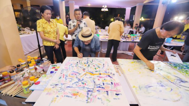 ทั้งนี้หลังจากเสร็จการเสวนา ศิลปินแห่งชาติได้ร่วมกันวาดภาพเพื่อนำไปประมูลเพื่อหารายได้สบทบทุนในการสร้างสรรค์ ประติมากรรมดอกบัว 100 ปีเมืองปทุมธานี