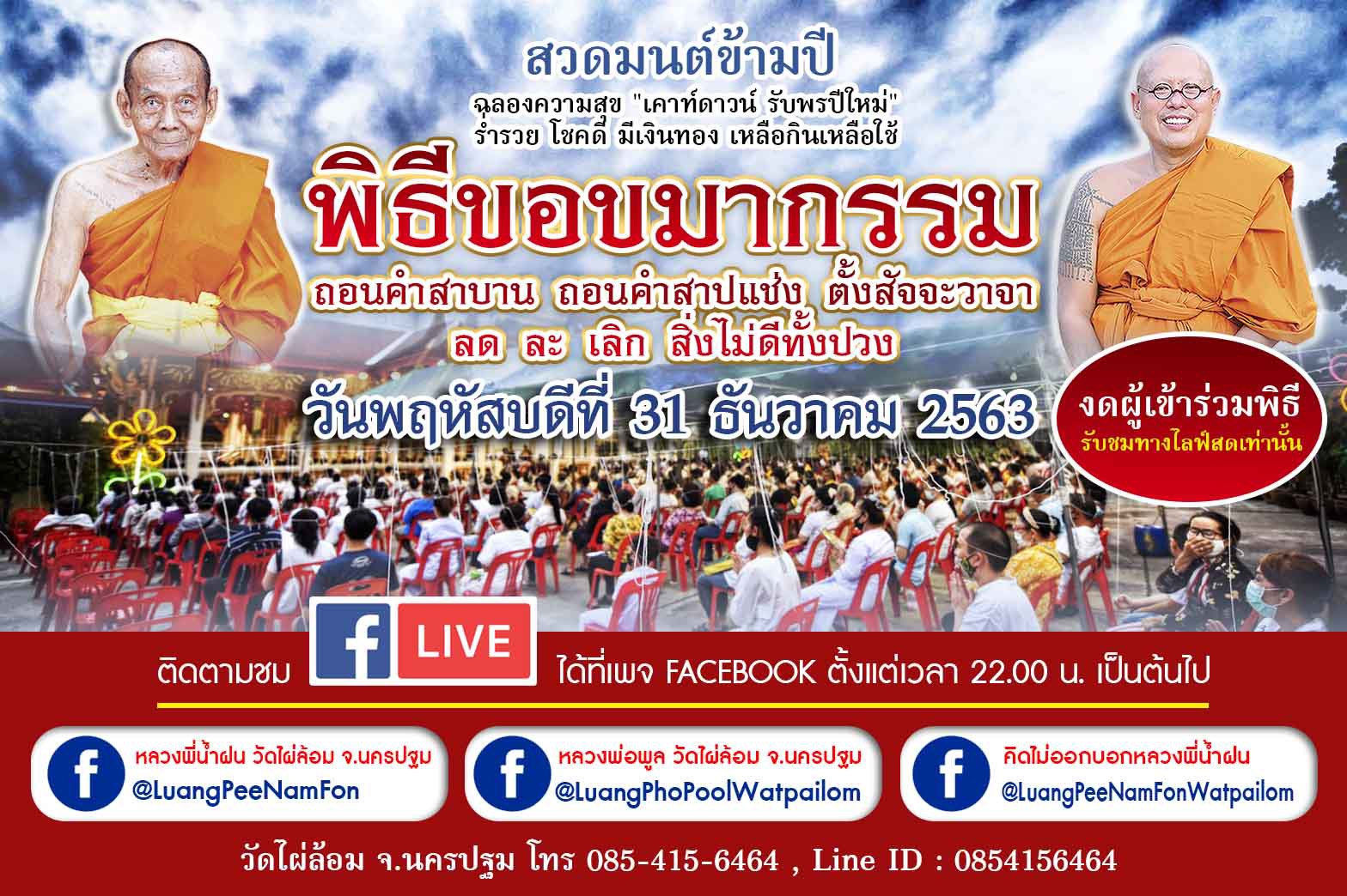 โดยติดตามชม FACEBOOK LIVE สวดมนต์ข้ามปี และ พิธีขอขมากรรม ได้ทางเพจ FACEBOOK ตั้งแต่เวลา 22.00 น. เป็นต้นไป