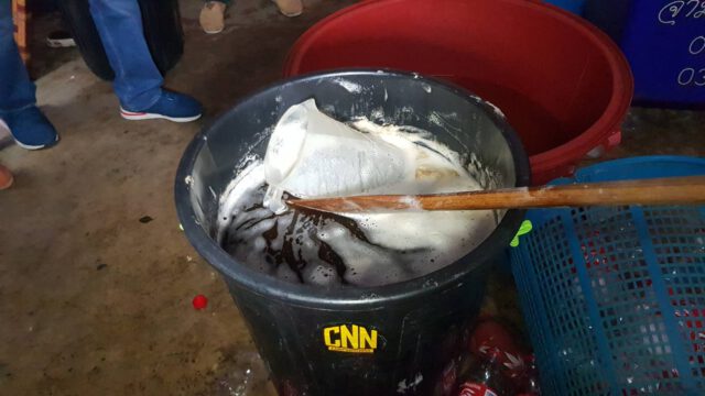 เบื้องต้นให้การรับสารภาพว่า เป็นผู้ผลิตและจำหน่ายน้ำกระท่อม จำหน่ายให้กับลูกค้าที่ส่วนใหญ่เป็นวัยรุ่นวัยทำงาน โดยจะจำหน่ายขวดละ 100 บาท ขนาดขวดน้ำอัดลม 1.25 ลิตร ผลิตสดใหม่ทุกวัน ตรงใจวัยรุ่นทั้งคนไทยและแรงงานข้ามชาติที่อยู่ในช่วงวัยทำงาน ส่วนของกลางที่ตรวจยึดได้นั้นมีทั้งน้ำกระท่อมที่ผลิตเสร็จแล้วแบบบรรจุขวดอยู่ในถังแช่เย็นจำนวนมาก อุปกรณ์การต้มน้ำกระท่อม สารที่ใช้เป็นส่วนผสมในน้ำกระท่อม ใบกระท่อมสด และกากใบกระท่อม จึงได้รวบรวมทั้งหมดไว้เป็นหลักฐาน