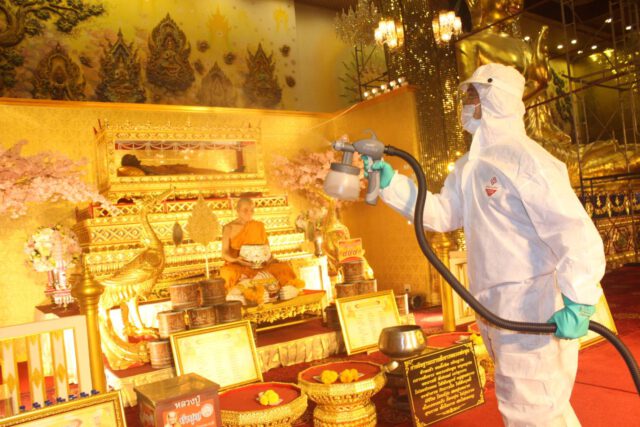 เปิดตัว “สเปร์ยนาโน 9” น้ำยาฆ่าเชื้อโควิด ระดมฉีดล้างเมรุ วัดไผ่ล้อม