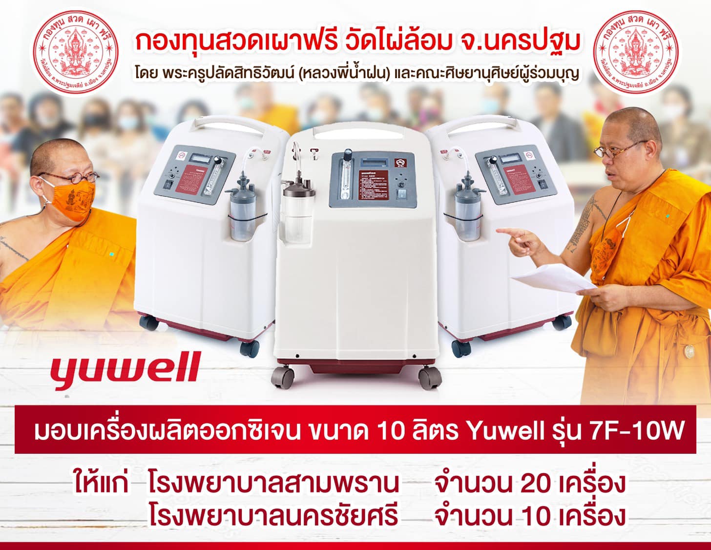 รวมทั้งยังจะดำเนิน ช่วยคนเป็น ด้วยการนำเงินที่ญาติโยมทำบุญเข้ากองทุน สวด เผา ฟรี วัดไผ่ล้อม ไปซื้อเครื่องผลิตออกซิเจน ช่วยเหลือผู้ป่วยในสถานการณ์โรคระบาด โควิด-19 ให้กับ โรงพยาบาลสามพราน จำนวน20เครื่อง โรงพยาบาลนครชัยศรี10เครื่อง ซึ่งรอผู้ผลิตส่งมาทาง กองทุน สวด เผา ฟรี วัดไผ่ล้อม จังหวัดนครปฐมก็จะดำเนินการมอบให้โรงพยาบาลทั้ง2แห่งทันที หากผู้มีจิตศรัทธาสามารถจะร่วมบุญ ได้ที่ วัดไผ่ล้อม จังหวัดนครปฐม โทร.085-4156464,0874156564 หรือร่วมบุญฝากบัญชี ธนาคารกสิกรไทย ชื่อบัญชี กองทุน สวด เผา ฟรี วัดไผ่ล้อม จังหวัดนครปฐม เลขที่บัญชี 516-1-01179-9