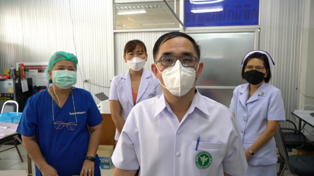 ……เจอแจก ก็จะให้ยาอย่างน้อยก็ยาพื้นฐานเช่นยาลดไข้ ยาละลายเสมหะส่วนยาอื่นๆเราก็จะมาประเมิน รวมทั้งถามทางผู้ป่วยอีกทีหนึ่ง ยาต้านไวรัสเรามีตั้งแต่บางส่วนที่แข็งแรงก็ไม่จำเป็นจะต้องรับยาเลย หรือบางส่วนก็จะได้ยาฟ้าทะลายโจรหรือกลุ่มที่เสี่ยงอีกก็จะได้ยากลุ่มต้านไวรัสก็คือฟาวิพิราเวียร์