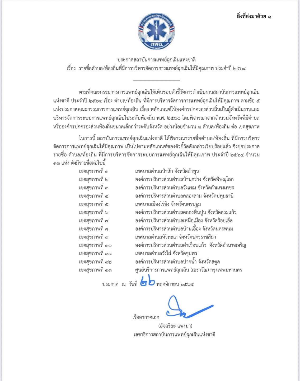 ได้มีหนังสือแจ้งประกาศ ตำบล/ท้องถิ่น ที่มีการบริหารจัดการการแพทย์ฉุกเฉินให้มีคุณภาพ ประจำปี 2564 และเชิญเข้าร่วมพิธีรับมอบโล่รางวัลการดำเนินงานและบริหารจัดการการแพทย์ฉุกเฉินขององค์กรปกครองส่วนท้องถิ่นอย่างมีคุณภาพประจำปี 2564
