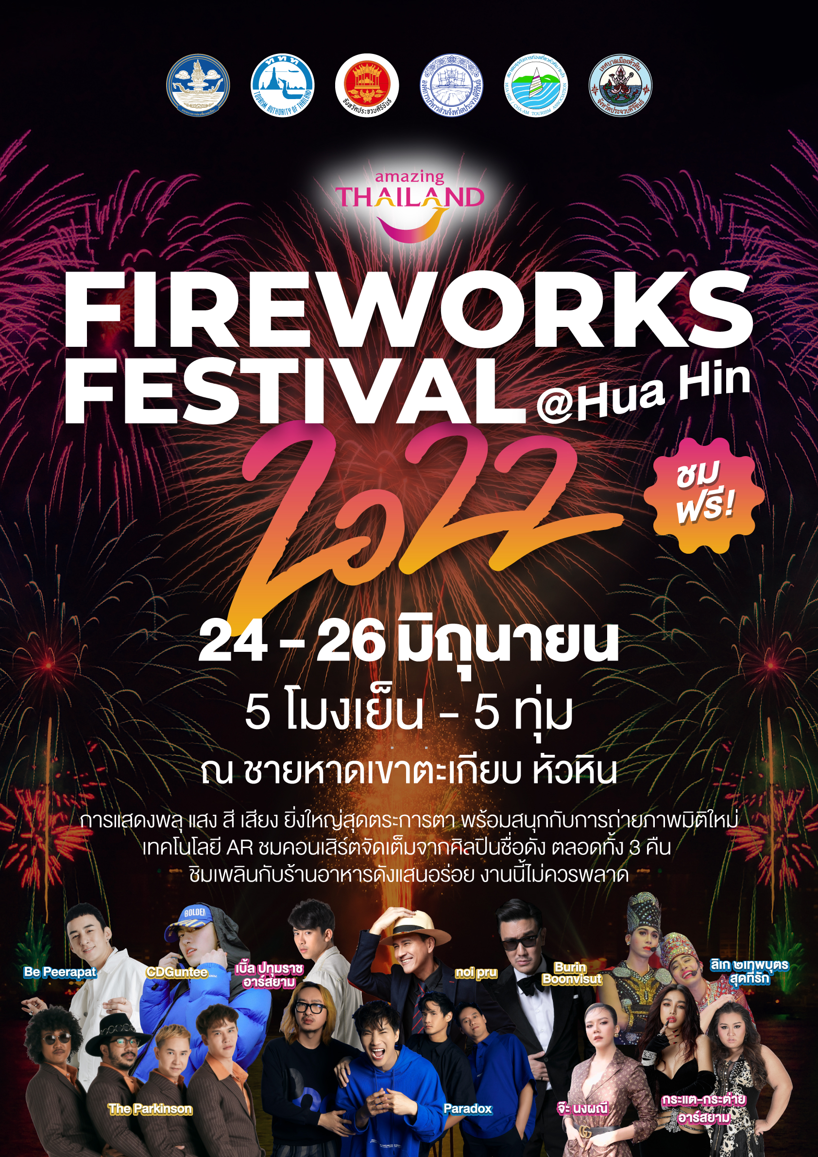 ประจวบคีรีขันธ์ เทศบาลเมืองหัวหิน องค์การบริหารส่วนจังหวัดประจวบคีรีขันธ์ สมาคมธุรกิจการท่องเที่ยวหัวหิน-ชะอำ ผนึกกำลังจัดงาน “Amazing Thailand Fireworks Festival 2022 @ Hua Hin” ระหว่างวันที่ 24-26 มิถุนายน 2565 เพื่อผลักดันให้เป็นจุดหมายปลายทางหลักให้แก่นักท่องเที่ยว ส่งเสริมกระตุ้นเศษฐกิจและกระจายรายได้สู่ท้องถิ่น-ชุมชน เพื่อเสริมสร้างการท่องเที่ยวที่มั่นคงและยั่งยืน