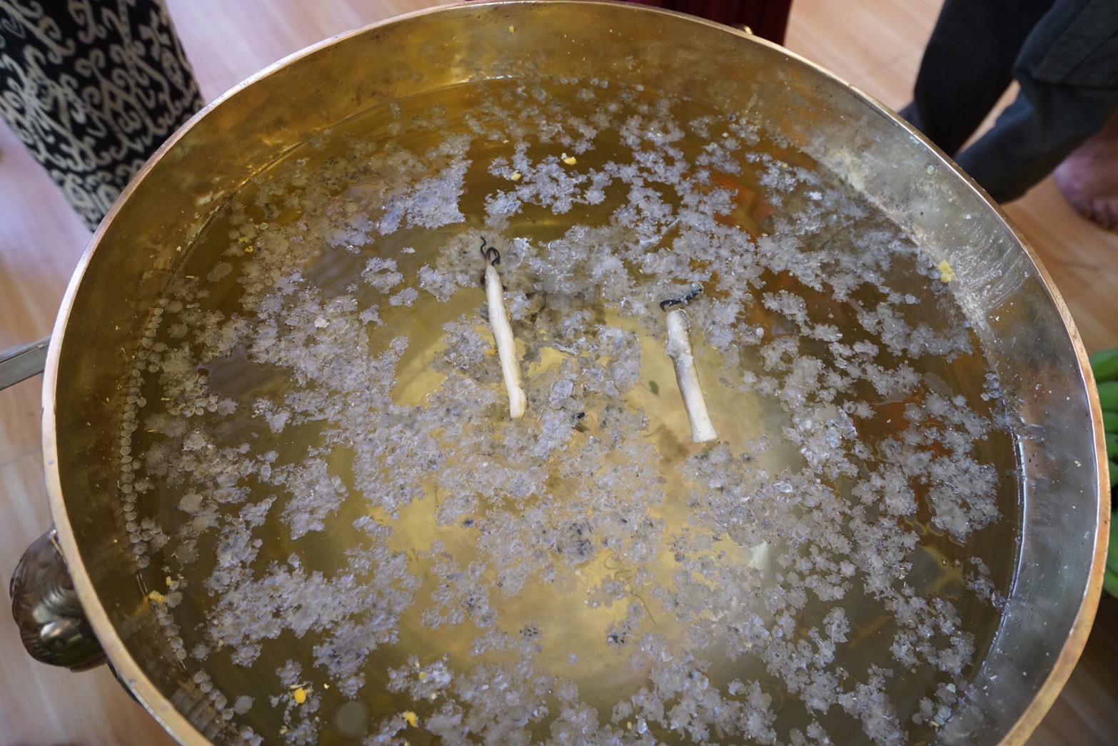 ซึ่งในพิธี พระครูปลัดสิทธิวัฒน์ หลวงพี่น้ำฝน ได้บริกรรมคาถาเจริญมนต์ และหยดน้ำตาเทียนในอ่างน้ำมนต์ใบใหญ่ ที่ตั้งอยู่หน้า พระองคุลีมาลเถระ และหลังเสร็จพิธี คณะเด็กวัดศิษย์วัดไผ่ล้อม รวมทั้งญาติโยมที่เข้าร่วมพิธีต่างจ้องมองเลขที่ หลวงพี่น้ำฝน ได้หยดน้ำตาเทียน ต่างนำไปเป็นเลขเด็ดในงวดหน้า โดยแต่ละคนมองไม่เหมือนกันอาจเป็นหมายเลข 51 บ้าง 81 บ้าง สำหรับกล้วยน้ำว้าทั้งหมด ทางวัดจะนำไปแจกจ่ายให้กับผู้เดินทางมาทำบุญที่วัดไผ่ล้อม นอกจากนี้คณะเด็กวัดศิษย์วัดไผ่ล้อม ยังได้ร่วมกันรับเงินที่ถูกลอตเตอรี่ จากแม่ค้าที่มารับแลกเงินถึงวัด พร้อมกับได้นำเงินถวาย คณะพระสงฆ์ ทั้งวัดไผ่ล้อมรวมทั้งหลวงพี่น้ำฝน จำนวน35รูปๆละ 2,000 บาท ทุกรูป
