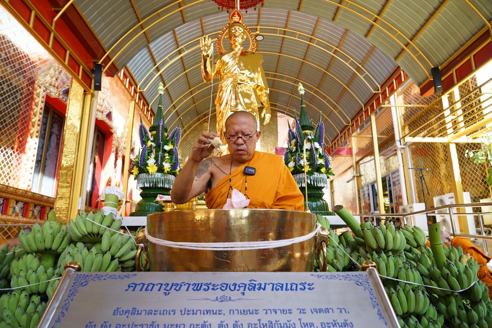 โดยก่อนเริ่มพิธี พระครูปลัดสิทธิวัฒน์ (หลวงพี่น้ำฝน) เจ้าอาวาสวัดไผ่ล้อม พร้อมพระสงฆ์จำนวน35รูป นั่งล้อมรอบ พระองคุลีมาลเถระ ที่มีขนาดความสูงกว่า 3 เมตร ที่ตั้งตระหง่านอยู่บนฐานอย่างสง่างาม และได้เจริญพระพุทธมนต์ เพื่อเสริมความเป็นสิริมงคล พร้อมกับที่คณะเด็กวัดศิษย์วัดไผ่ล้อม ได้นำกล้วยน้ำว้าดิบจำนวน108 เครือวางไว้รายล้อมด้านล่างฐานพระองคุลีมาลเถระ