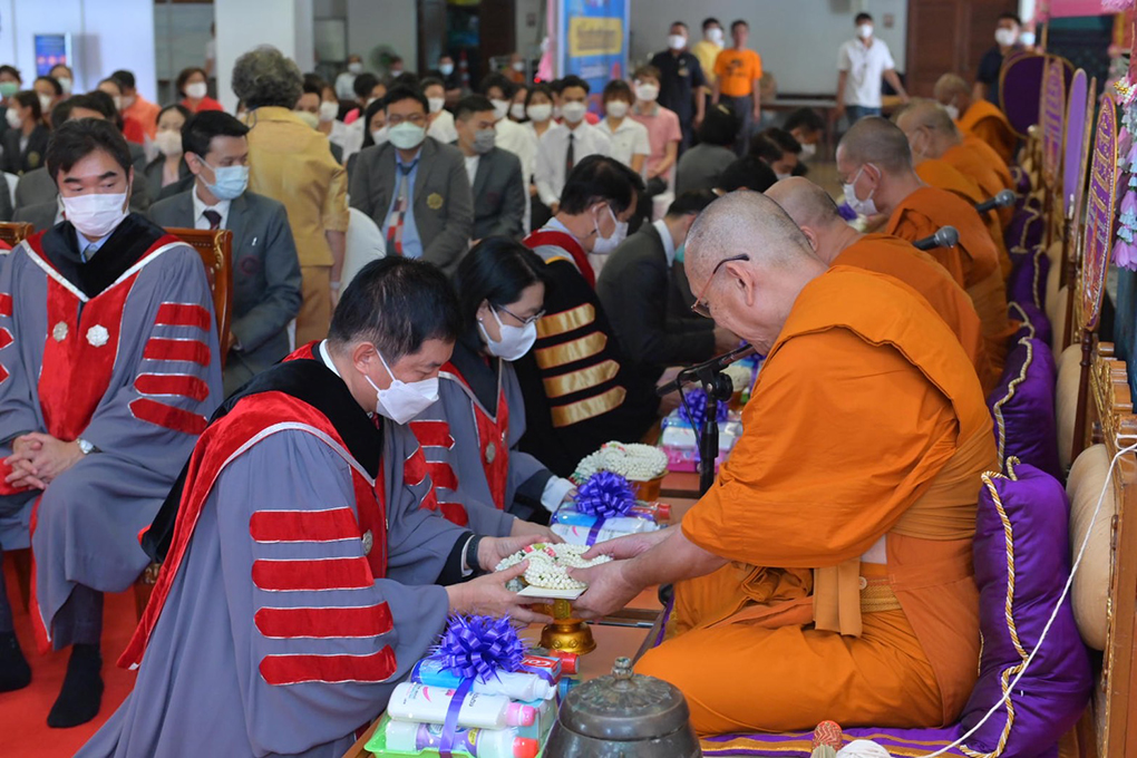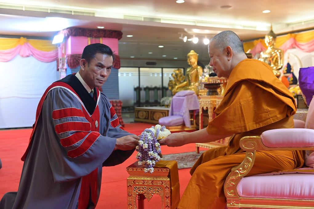 รศ.ดร. สมชาย สันติวัฒนกุล อธิการบดี มหาวิทยาลัยศรีนครินทรวิโรฒ (มศว)เป็นประธาน จุดธูปเทียนบูชาพระรัตนตรัย ก่อนอ่านคำประกาศเกียรติคุณ สมเด็จพระมหารัชมงคลมุนี (ธงชัย ธมฺมธโช)ปริญญาปรัชญาดุษฎีบัณฑิตกิตติมศักดิ์ สาขาสังคมศึกษา