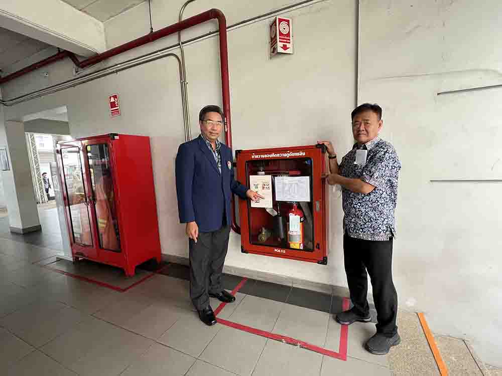 ทางด้านนายบูรพา บรรจงเลี้ยง ผู้จัดการแผนกวิศวกรรมอาคารและนายอนุ เอื้อประเสริฐชัย เจ้าหน้าที่วิศวกรรมอาคาร ได้ตรวจสภาพถังดับเพลิงและอุปกรณ์ต่างๆ ให้มีความพร้อม มีสภาพสมบูรณ์ตามกำหนดการใช้งาน หากมีสภาพชำรุดหรือหมดอายุหรือเก่าเกินไปจะต้องดำเนินการเปลี่ยนเป็นถังที่ได้มาตรฐานทันที สำหรับการตรวจสภาพถังดับเพลิงให้ปลอดภัยและพร้อมใช้งานอยู่เสมอ ได้แก่ การตรวจสอบมาตรวัดแรงดันโดยสังเกตเข็มในมาตรวัดต้องชี้ที่ช่องสีเขียวเสมอ, การตรวจสลักและซีลให้อยู่ในตำแหน่งที่ล๊อคอยู่ไม่ฉีกขาด, การตรวจคันบีบในสภาพที่สมบูรณ์ ไม่บิดงอ, การตรวจสภาพสายฉีดโดยยางต้องไม่เสื่อมสภาพ ไม่แข็ง ไม่ฉีกขาด, การตรวจสภาพตัวถังดับเพลิงต้องไม่บุบ หรือบวม ไม่ขึ้นสนิม และตรวจอายุการใช้งานของถังดับเพลิงสีแดง ผงเคมีแห้ง อายุ 3-5ปี และถังดับเพลิงสีเขียวและสีอื่นๆ สารสะอาดและเคมีน้ำ อายุ8-10ปี ซึ่งผลการตรวจสภาพถังดับเพลิงและอุปกรณ์ต่างๆในครั้งนี้อยู่ในสภาพที่สมบูรณ์.