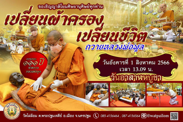 ในปีนี้เป็นวาระพิเศษ 111 ปีชาตกาลพระเดชพระคุณหลวงพ่อพูล 11พฤศจิกายน 2455 –11 พฤศจิกายน 2566 ในการเปลี่ยนผ้าครองสรีระสังขารพระเดชพระคุณหลวงพ่อพูล ก็จะมีของที่ระลึก เป็นชิ้นส่วนจีวรของพระเดชพระคุณหลวงพ่อพูล เพื่อให้ศิษยานุศิษย์เก็บไว้บูชาเป็นสิริมงคล เป็นเครื่องยึดเหนี่ยวจิตใจด้วย การได้ร่วมบุญเปลี่ยนผ้าครองถวายหลวงพ่อพูลนั้น ถือเป็นการบูชาผู้มีพระคุณประการหนึ่ง จึงมีอานิสงส์มาก อาจเปลี่ยนชีวิตของคนให้ไปในทางที่ดีได้ เจริญขึ้นได้ อาตมาจึงขอเจริญพรประชาสัมพันธ์พิธีดังกล่าวนี้แก่สาธุชนทั้งหลายผู้มีจิตศรัทธา โดยสามารถมาร่วมงานได้ที่วิหารหลวงพ่อพูล วัดไผ่ล้อม จังหวัดนครปฐม ในวันที่ 1 สิงหาคม 2566 เวลา 13.09 น. ขอเจริญพร