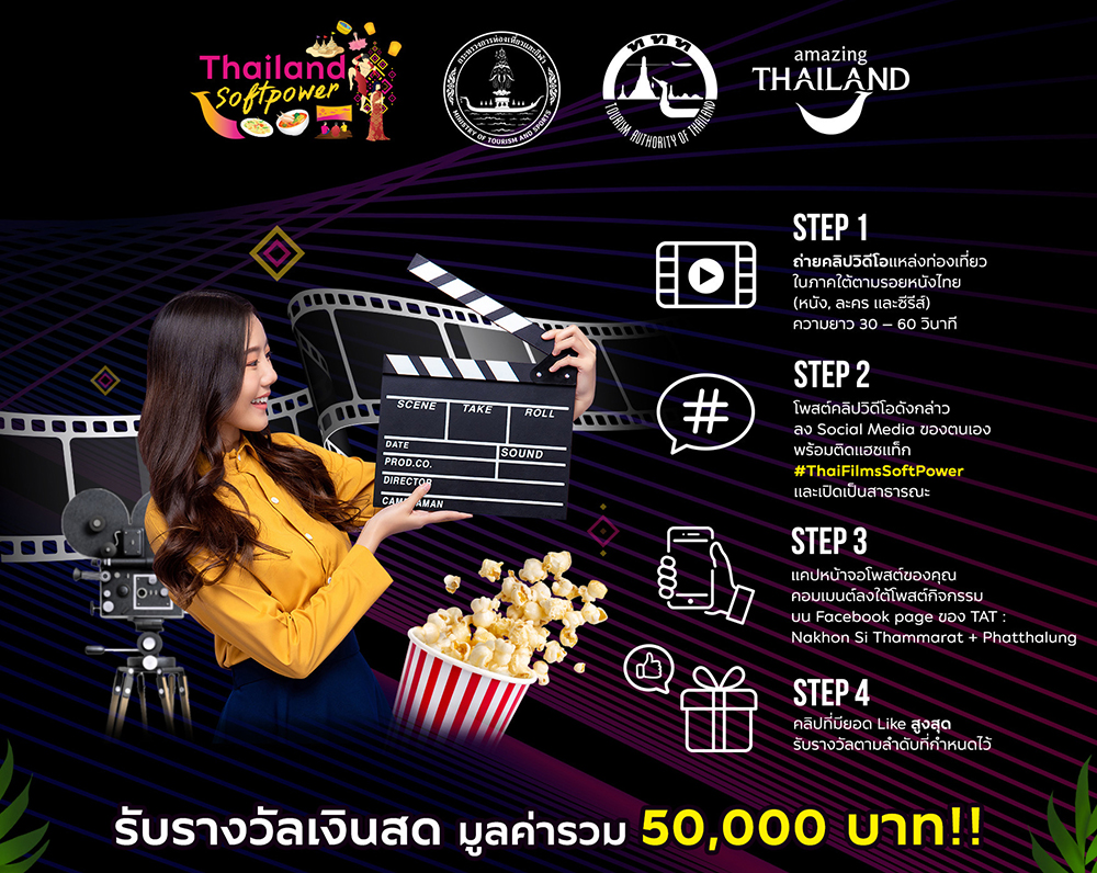 ทั้งนี้ทางโครงการฯ ได้จัดทำกิจกรรม “Thai Films Soft Power” เพื่อผลักดัน Soft Power ของไทยในมิติต่าง ๆ ไม่ว่าจะเป็น วัฒนธรรม , อาหาร , ศิลปะ , สถานที่ท่องเที่ยว และอื่น ๆ อีกมากมาย ผ่านภาพยนตร์ไทย โดยทางโครงการฯ ได้เชิญชวนให้ทุกท่านได้ร่วมสนุกกับกิจกรรมโดยถ่ายคลิปวิดีโอนำเสนอแหล่งท่องเที่ยวในภาคใต้ตามรอยภาพยนตร์ไทย ไม่ว่าจะเป็นภาพยนตร์ ละคร และซีรีส์ เรื่องใดก็ได้ พร้อมโพสต์วิดีโอดังกล่าวลงบน Social Media ของตนเอง พร้อมติดแฮชแท็ก #ThaiFilmsSoftPower หลังจากนั้นให้บันทึกรูปภาพหน้าจอโพสต์นั้นมาคอมเมนต์ใต้โพสต์กิจกรรมบน Facebook fanpage : TAT : Nakhon Si Thammarat + Phatthalung (https://www.facebook.com/TAT.NST/posts/pfbid0yLRg4Vp28jcNheydAM32ML3bovVH5Eqiwr2Q7vERTTQCf44DDGN1FjPaWbjNHDNel) โดยคลิปใดที่มียอดไลค์สูงสุด จะได้รับรางวัลเงินสดไปเลยทันที มูลค่ารวมกว่า 50,000 บาท สามารถร่วมกิจกรรมได้ตั้งแต่วันนี้ – 6 สิงหาคม 2566