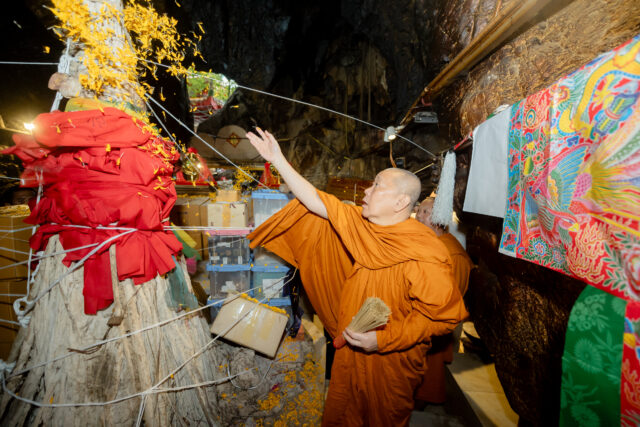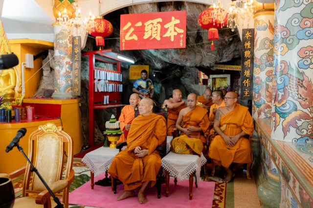 ซึ่งอาจารย์แขก รือเสาะ ได้นิมนต์ เจ้าประคุณสมเด็จพระมหารัชมงคลมุนี และคณะสงฆ์จีน พระคณาจารย์5องค์ ร่วมอธิฐานจิตพุทธาภิเษกวัตถุมงคล ต่อจากนั้น พระสงฆ์ฝ่ายจีนนิกายโดยพระราชาคณะเป็นผู้ประกอบพิธี ทำพิธีบูชา24ทวาราบาล ก็คือ 24 ทวยเทพหลักของสวรรค์ทำพิธีโดยจีนนิกายรวมถึงทำพิธีบูชา“เทพเจี่ยบึงเถากง” ก็คือเจ้าพ่อเขาใหญ่เกาะสีชัง และที่อาคารโรงลิเกด้านล่างริมทะเลด้านล่าง พระสงฆ์ฝ่ายอนัมนิกาย ก็คือฝ่ายพระญวนเป็นผู้ประกอบพิธีพิธีบูชาดาว และก็ทำพิธีเทกระจาด เพื่อโปรดวิญญาณทางทะเล