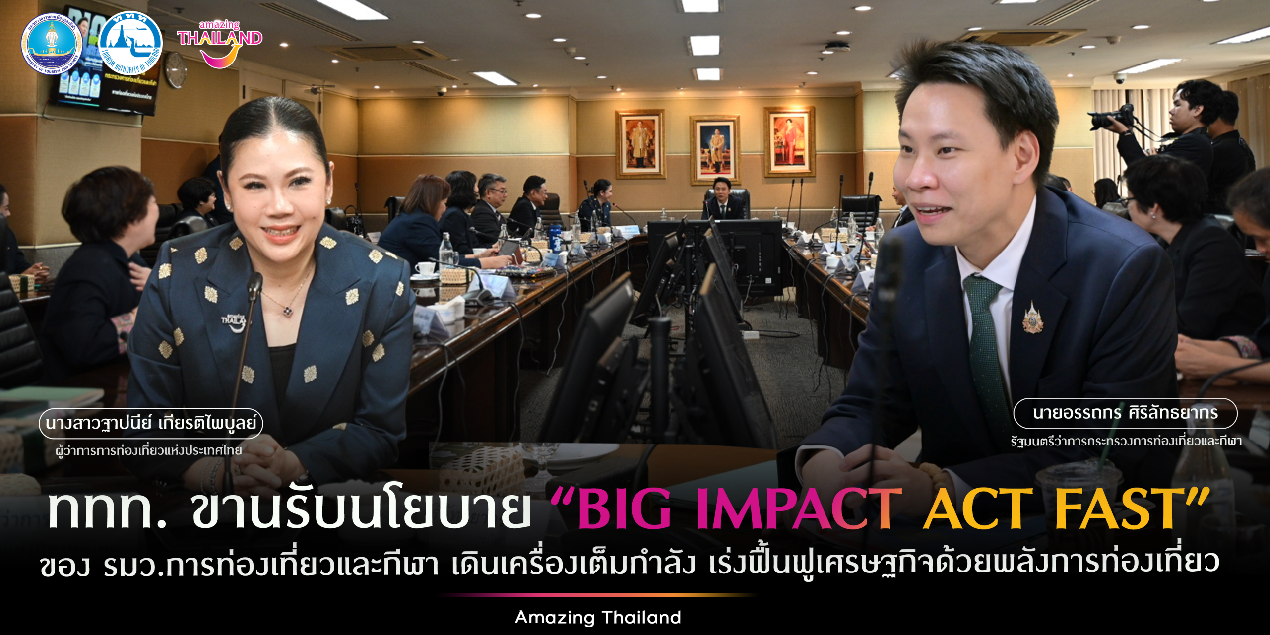 โดยนายอรรถกร ศิริลัทธยากร รมว. กระทรวงการท่องเที่ยวและกีฬา ได้มอบนโยบายภาย ใต้แนวคิด “Big Impact Act Fast” เพื่อเร่งเดินหน้ากระตุ้นท่องเที่ยวไทย โดยให้ดำเนินการมาตรการดึงดูดนักท่องเที่ยวจีน และมุ่งโฟกัสตลาดหลัก เพื่อฟื้นฟูเศรษฐกิจ พร้อมเสริมมาตรการสร้างความปลอดภัยด้วยแนวคิด “เที่ยวไทยมั่นใจ ปลอดภัยทุกย่างก้าว” ในการดูแลนักท่องเที่ยวอย่างเข้มข้น เพื่อสร้างความเชื่อมั่นในการเดินทางให้ประเทศไทยยังคงเป็นจุดหมายปลายทางยอดนิยมของนักท่องเที่ยวทั่วโลก