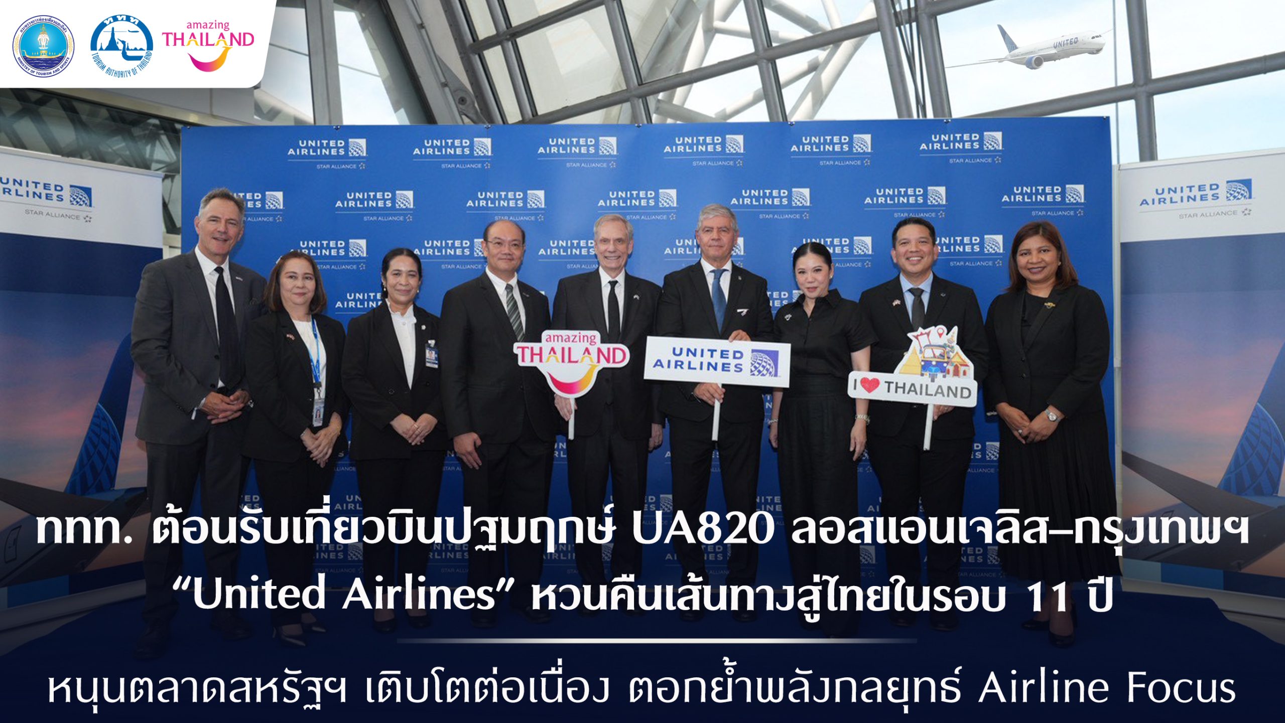 ททท. ต้อนรับเที่ยวบินปฐมฤกษ์ UA820 ลอสแอนเจลิส–กรุงเทพฯ United Airlines หวนคืนน่านฟ้าไทยในรอบ 11 ปี หนุนตลาดสหรัฐฯ โตต่อเนื่อง สะท้อนพลังกลยุทธ์ Airline Focus