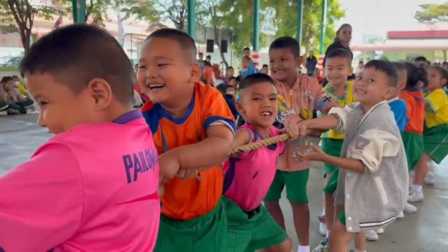 โดยภายในการจัดงานนอกจากจะมีการจัดแจกจ่ายขนมและอุปกรณ์การเรียนแบบไม่อั้นแล้ว ยังมีการจัดการเล่นและกีฬาเพื่อสร้างความสามัคคีและเสริมการพัฒนา เช่นการแข่งขันชักเย่อ แบบทีมของนักเรียนในห้องเรียนและชั้น ส่วนทีมเข้ามาร่วมแข่งขันกันอย่างคึกคักเรียกเสียงเฮได้ลั่นสนามหน้าโรงเรียน