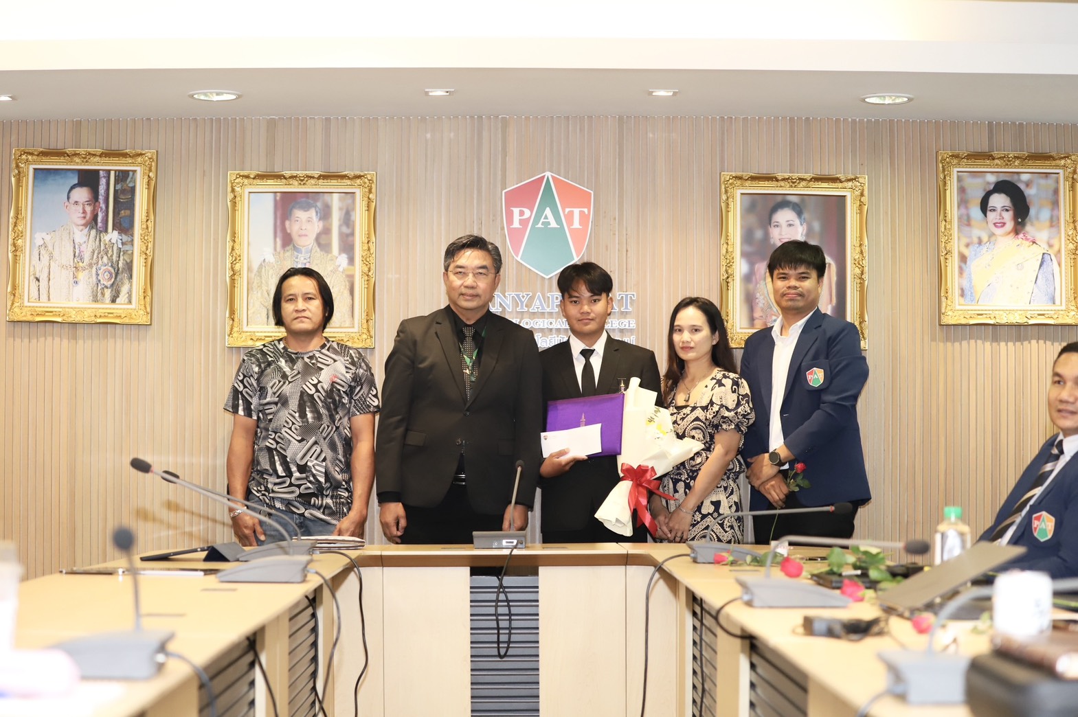 นายวิเชียร เนียมน้อม ผู้แทนผู้รับใบอนุญาตและผู้อำนวยการวิทยาลัยเทคโนโลยีปัญญาภิวัฒน์ และคณะผู้บริหารร่วมแสดงความยินดีกับนายณรงค์พล สุขมี นักศึกษาระดับประกาศนียบัตรวิชาชีพชั้นสูง (ปวส.) ชั้นปีที่2 สาขาวิชาไฟฟ้ากำลัง ซึ่งส่งผลงานร่วมแข่งขันได้รับรางวัลเกียรติบัตรเหรียญทอง (ระดับชาติ) ในการแข่งขันทักษะการควบคุมเครื่องกลไฟฟ้า ประจำปีการศึกษา 2566 จัดโดยสมาคมวิทยาลัยเทคโนโลยีและอาชีวศึกษาเอกชนแห่งประเทศไทยในพระราชูปถัมภ์สมเด็จพระเทพรัตนราชสุดาฯสยามบรมราชกุมารี