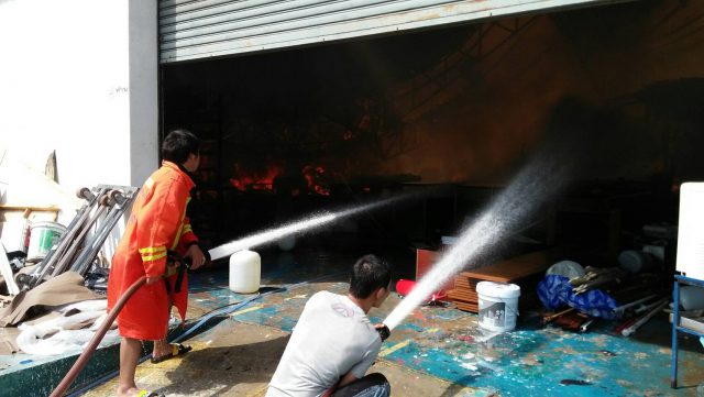 ระดมฉีดน้ำในตัวโรงงานที่เกิดเหตุกำลังลุกไหม้ อย่างรุนแรงใช้เวลากว่า 1 ชั่วโมงสามารถควบคุมเพลิงไว้ได้