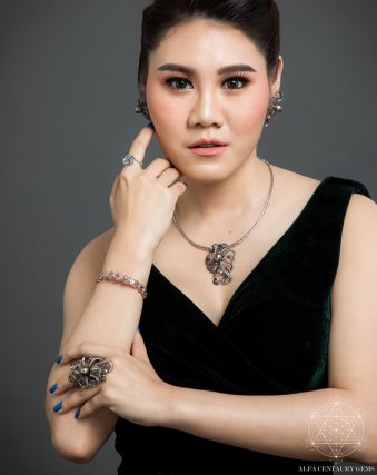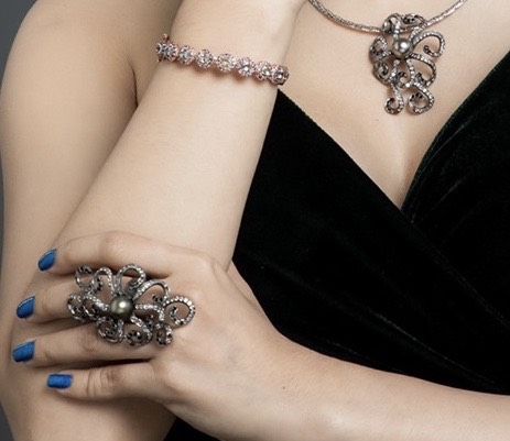โดยเฉพาะต่างหูที่ใช้ไข่มุกตาฮิติร่วมกับเพชร จะยิ่งดึงดูดออร่าออกมาได้ถึงขีดสุด  ตัวเรือนประดับด้วย WHITE TOPAZ    BLACK SPINAL    SMOKE QUARTZ